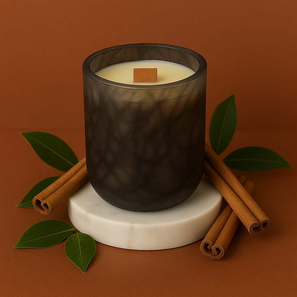 10 oz Honey and Cinnamon scented beeswax and coconut wax candle in a smokey black or white frosted glass container with a crackling wooden wick. 100% handmade in California from organic and locally sourced ingredients. Scented with essential oils for a refreshing, non-toxic, aroma.